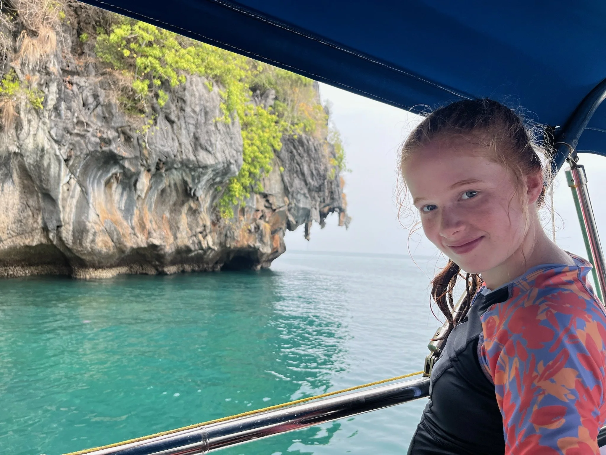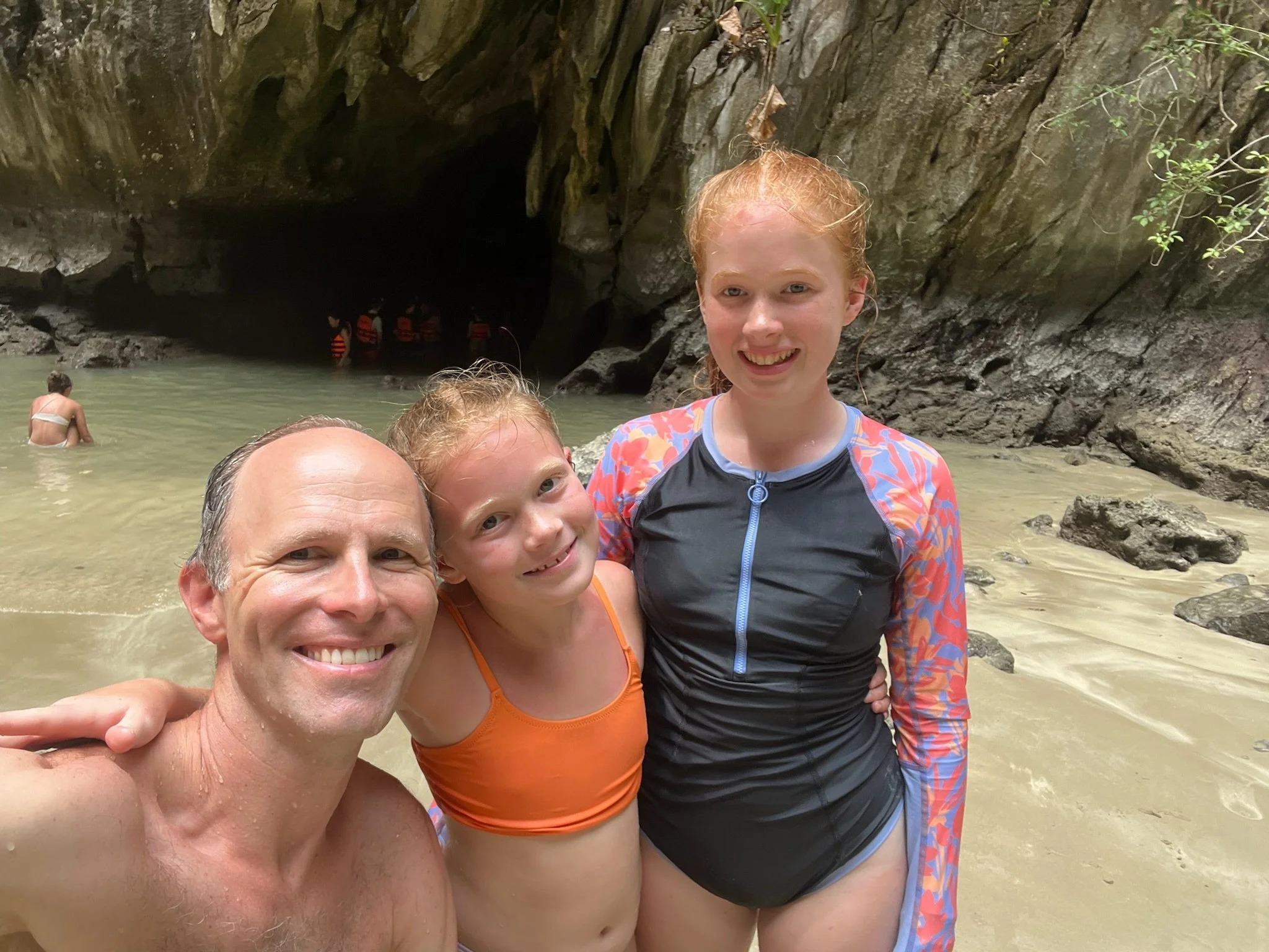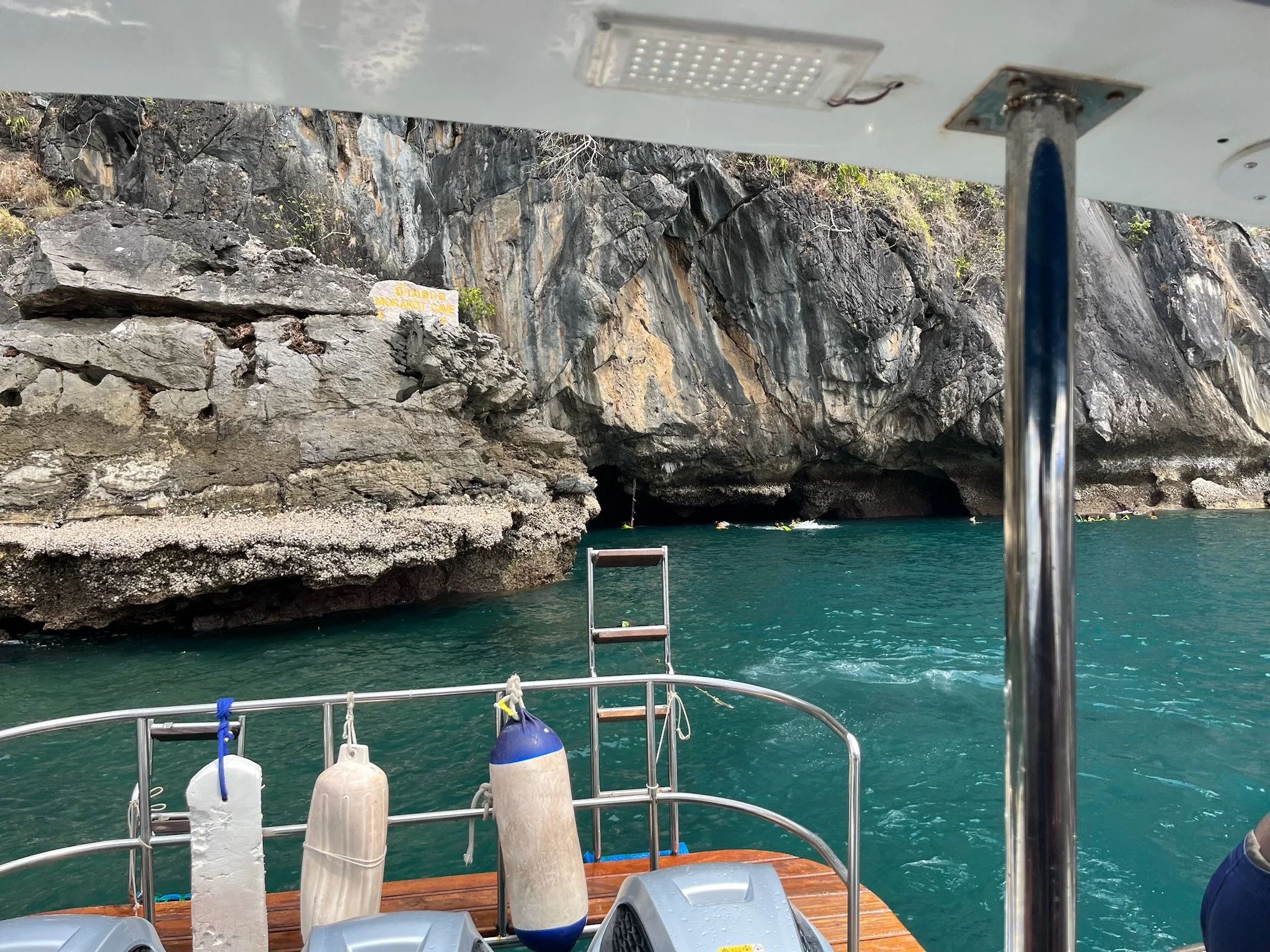 Shown here is the entrance to Marakot Cave, also known as Emerald Cave, which we were invited to swim through. Given the language barrier, it was a little tough to tell what we were getting ourselves into. I ascertained that it was an 80m swim and that it shouldn’t be a problem if you are a decent swimmer. The girls were game so we went for it. Our guide led the way in and we followed. A few minutes in, all we could see was his headlamp out in front of us. Here I am taking our 10 and 13 year old daughters swimming through a decent swell, surrounded by cliffs into a cave in the Andaman Sea - for a brief moment, it was hard not to wonder if I was making a good parenting choice. Every time I have one of those moments (like after dark on a White Mts backpacking trip when we are searching for a place to pitch our tents via headlamp or zip-lining several hundred feet in the air over a deep gorge in central Belize), I appreciate watching the girls rise to the occasion. I expected them to be a touch spooked but they did great. We stayed close together and before long we could see some light around a bend up ahead. As we emerged on the other side we discovered that the cave led to a small interior area of the island surrounded by cliffs.