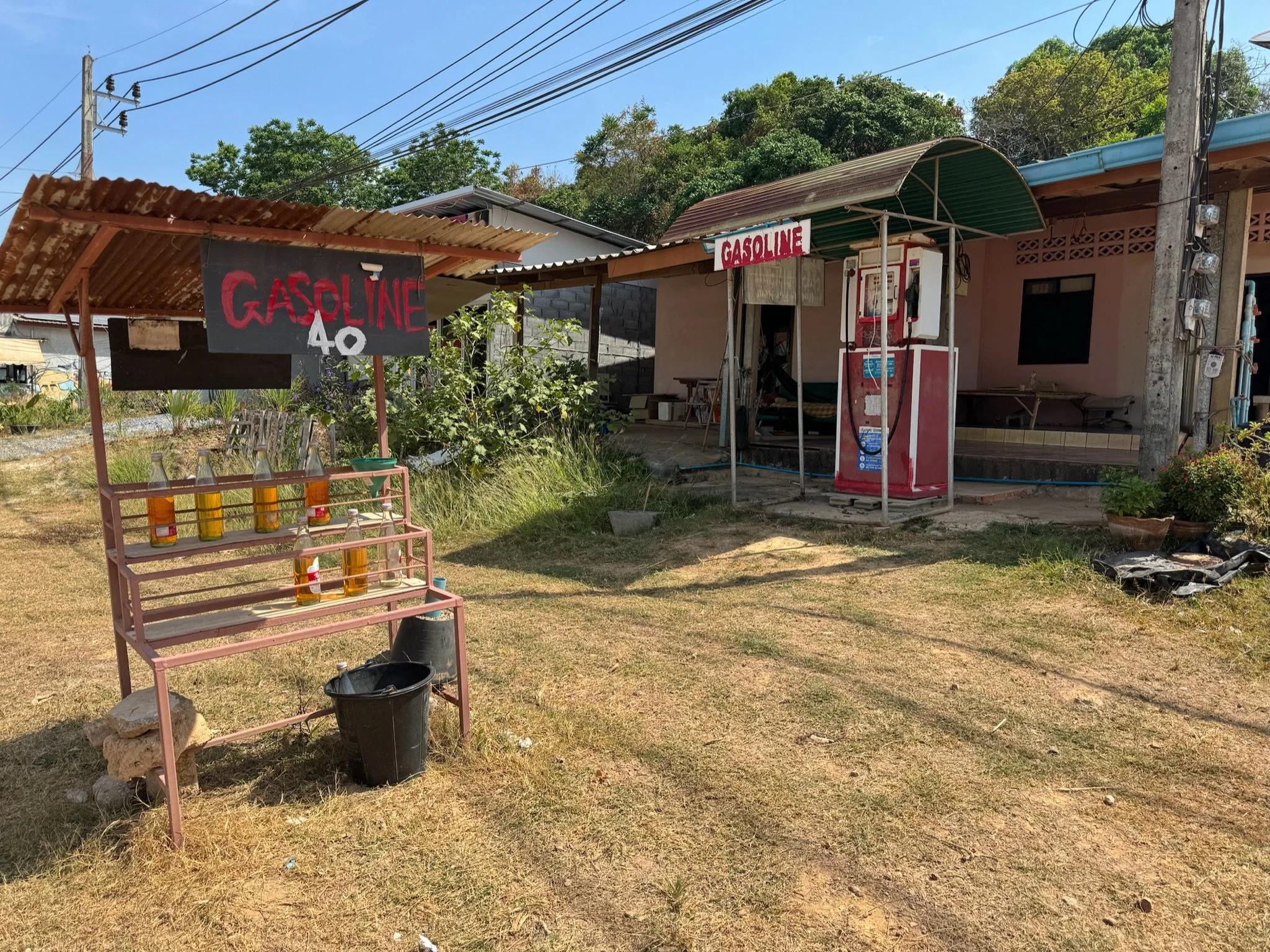 You want to gas up your motorbike, motorbike tuktuk, motorcycle, car? These little stands are everywhere. It’s literally just a bunch of glass bottles with gas decanted into them.